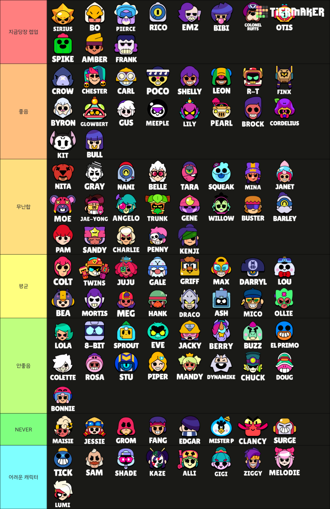 한달 주기로 신규캐릭터 반영과 함께 순위를 업데이트 하고있습니다. 최신 캐릭터인 시리우스, 피어스, 글로이는 적용되었고, 나지아 등이 출시할 예정입니다. 그외 최신 이벤트나 공략정보가 궁금하다면 브롤스타즈 공식카페를 참고해보세요.