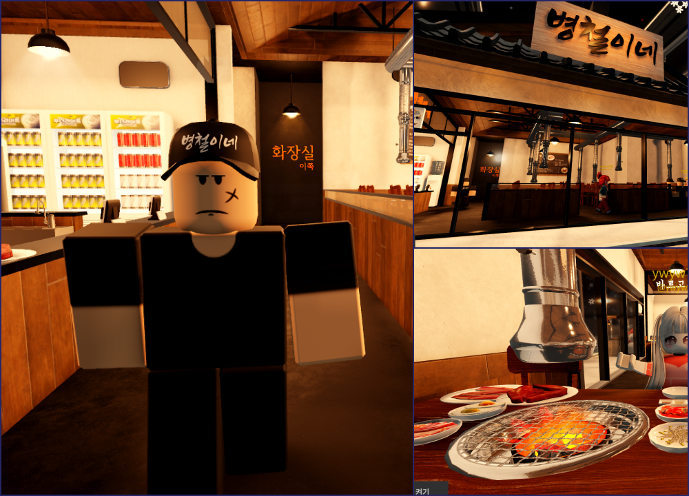 영어로 코리안 BBQ 레스토랑, 즉 한국식 고깃집을 체험하는 게임입니다. 식당에 들어가 테이블에 앉아서 벨을 누르고 직원을 불러 원하는 삼겹살과 목살 등의 고기부위와 계란찜 된장찌개 같은 사이드메뉴를 선택할 수 있습니다. 고기를 구우면서 가위로 자르고 먹는 모습이 귀엽게 연출되고 상황극 하기도 좋아서 은근 동접자가 많은 게임입니다.