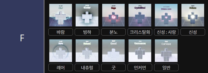 <바람 / 빙하 / 분노 / 크리스탈화 / 신성:사랑 / 레어 / 내츄럴 / 굿/ 언커먼 / 일반>