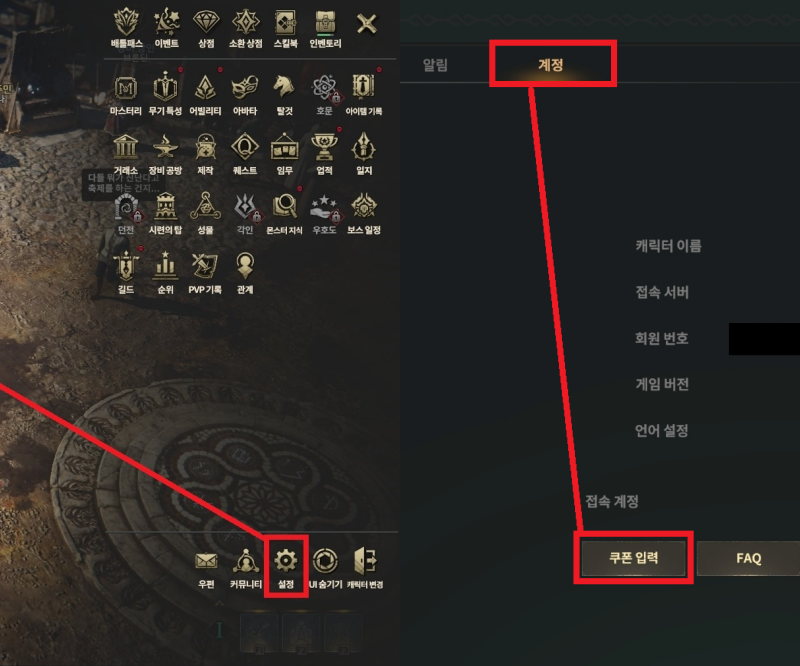 3. 설정에서 → 계정탭 → 쿠폰입력