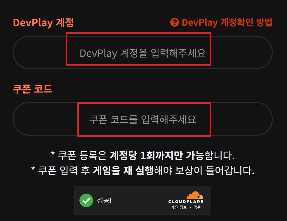 2. DevPlay 계정과 쿠폰코드를 입력하세요