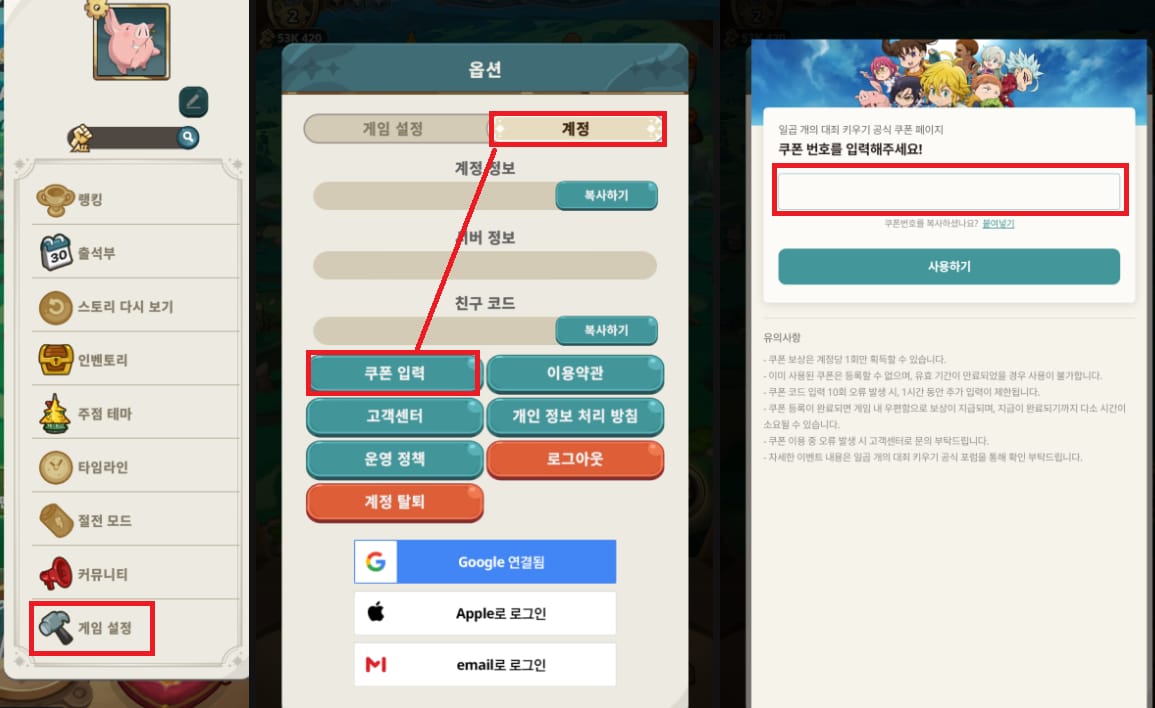 일곱 개의 대죄 키우기 쿠폰 입력방법