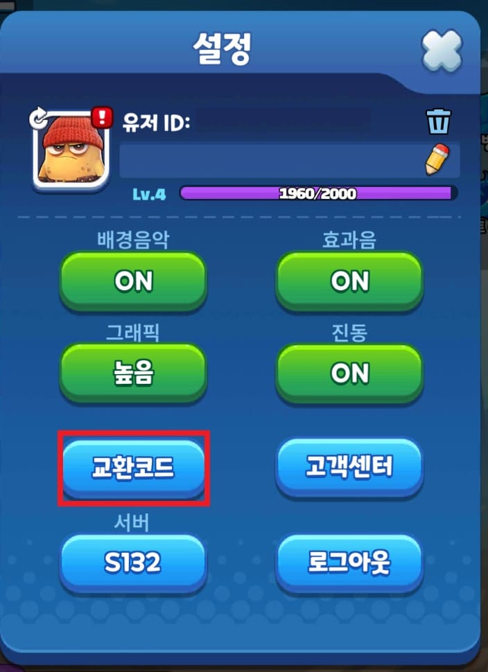 2. 설정 탭에서 "교환코드"를 클릭.