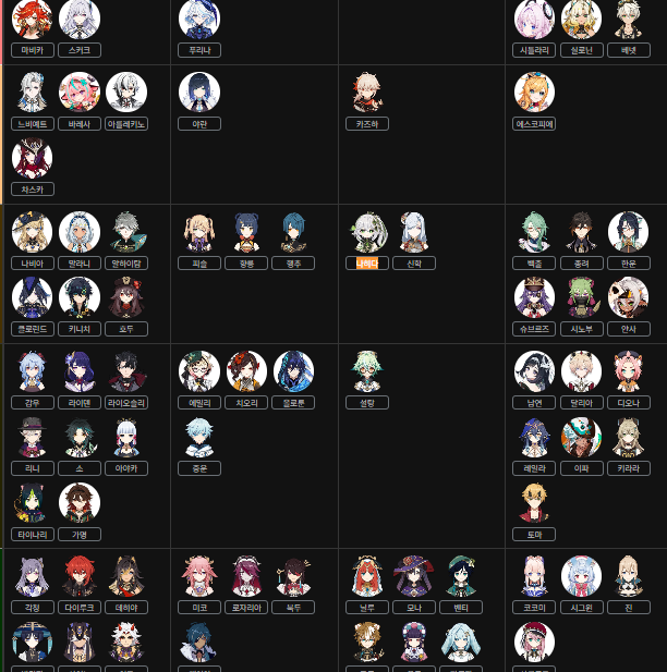 | 0 티어 | 아를레키노(Arlecchino) 마비카(Mavuika) 느비예트(Neuvillette) 스커크(Skirk) 에스코피에(Escoffier) 푸리나(Furina) 나히다(Nahida) 라이덴 쇼군(Raiden Shogun) 향릉(Xiangling) 행추(Xingqiu) 야란(Yelan) 베넷(Bennett) 시틀라리(Citlali) 카즈하(Kaedehara Kazuha) 나히다(Nahida) 실로닌(Xilonen) 종려(Zhongli) |