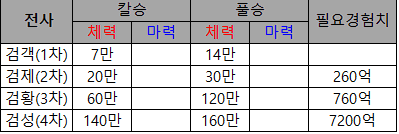 1차 [검객]으로 직업명이 부여되며 승급기준 체력 7만, 마력 14만입니다.
