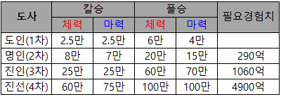 1차 [도인]으로 직업명이 부여되며 승급기준은 체력2.5만, 마력2.5만