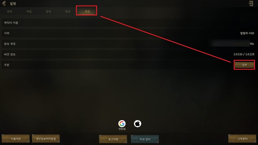 하단 [설정]에서 → [계정] 탭 → [쿠폰 입력] 후 우편함에서 수령하면 끝.