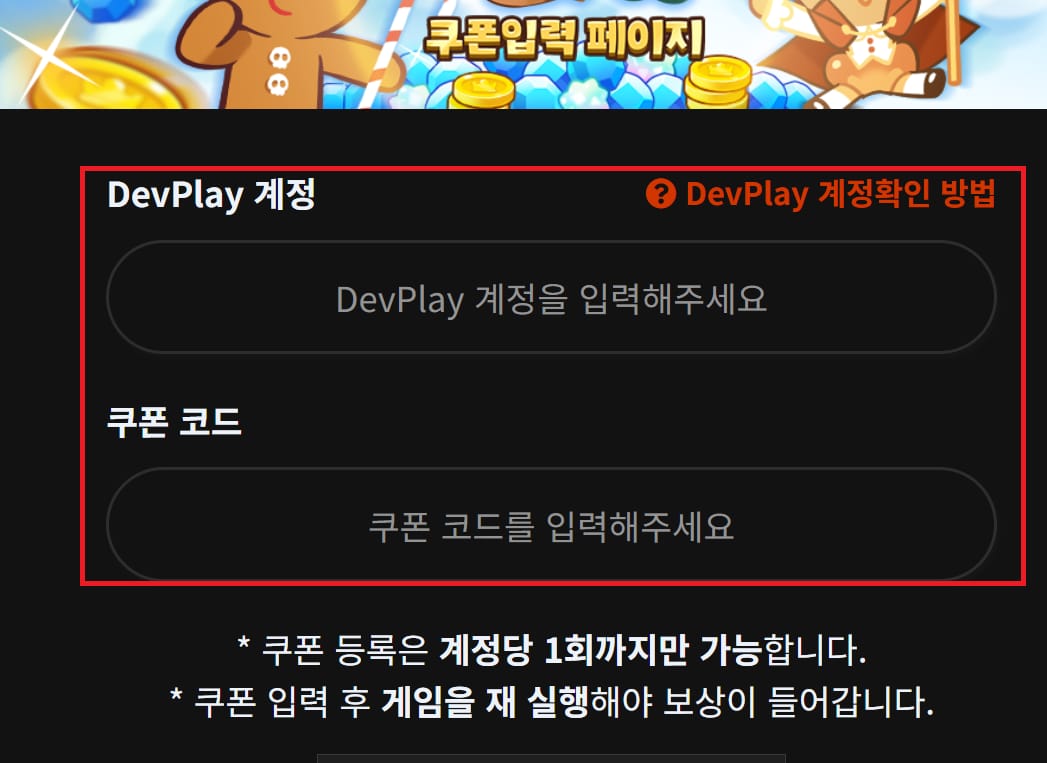 2. DevPlay 계정과 쿠폰코드를 입력.