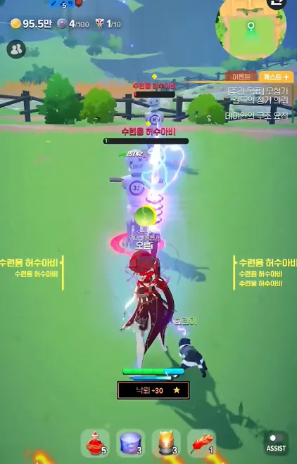 - 질풍 자원 도박 구조: 4스택 모아서 강화 스킬 쓰는데 25~34% 확률로 추가 자원 나오면 계속 난사 가능한 반면, 운 없으면 평타만 치다 끝나는 운빨 게임이라 딜량 편차 심함