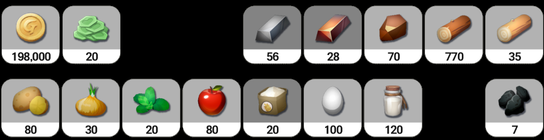 198000 골드, 20토큰, 특수강괴 56, 합금강괴 28, 동광석 70, 통나무 770, 상급통나무 35, 감자 80, 양파 30, 허브 20, 사과 80, 밀가루 20, 달걀 100, 우유 120, 연금부스러기 7