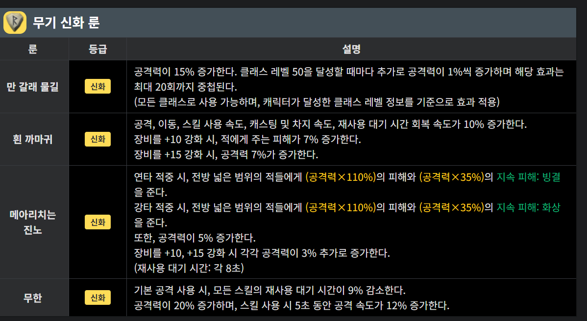마비노기 모바일 전설 및 신화 무기 룬 최신 티어표