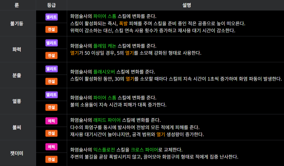 | 횃불 | S+ | 작열 디버프 적 공격 시 치명타율 증가 |