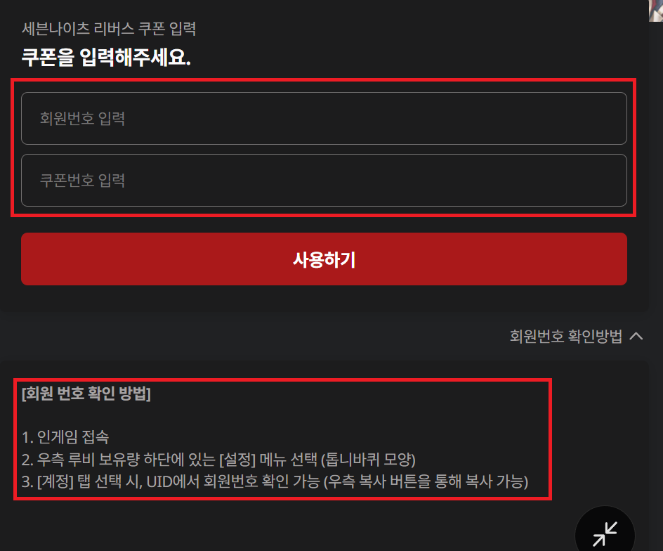 5. 복사한 UID와 쿠폰을 입력하고 확인