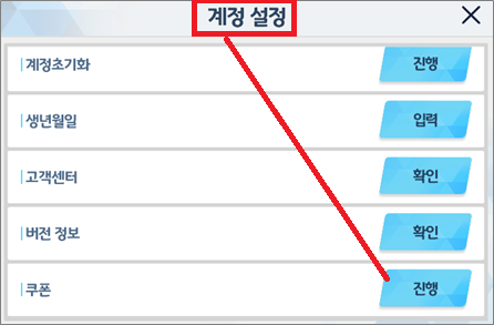 2. [메뉴 모음] → [계정] → [쿠폰] 선택 후 쿠폰 번호를 입력후 확인을 누르면 끝