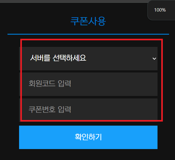 3. 서버선택, 회원코드 및 쿠폰을 입력한 뒤 확인