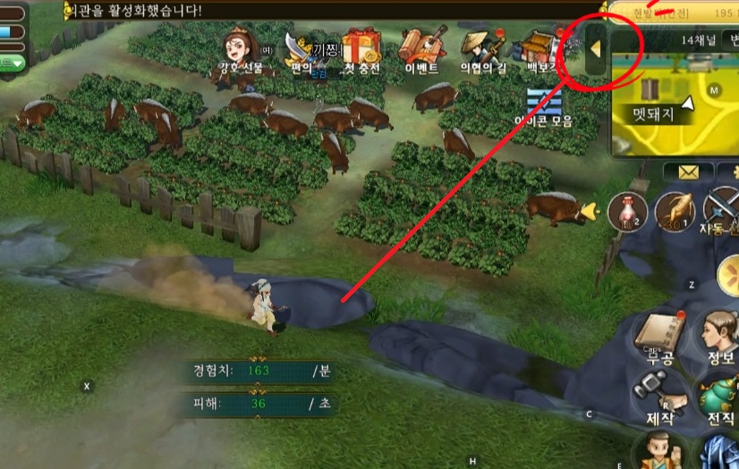 1. 게임접속후 우측 상단 화살표를 눌러 [이벤트] 메뉴를 찾습니다.