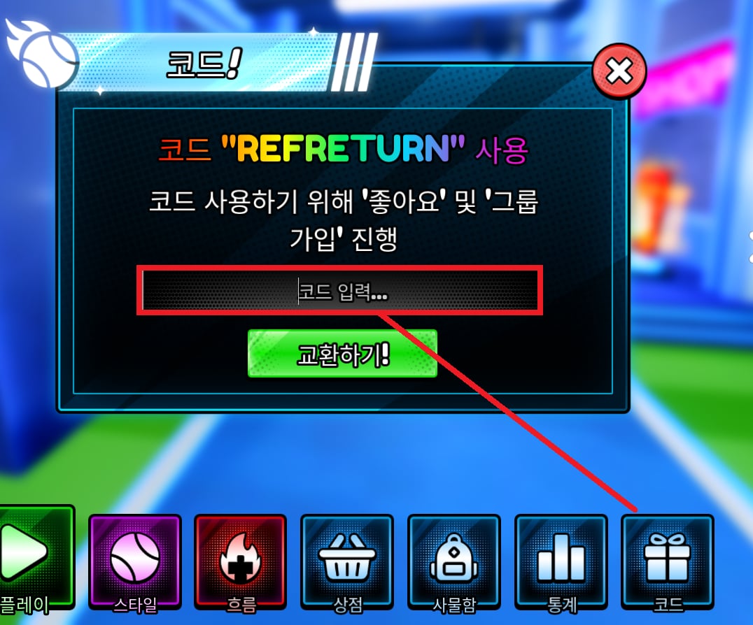 3. 코드 입력창에 복사 붙여넣기 후 교환하기!