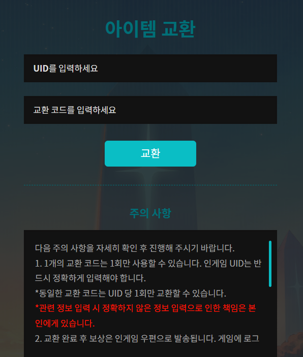 4. 리딤코드 입력 사이트로 이동해서 UID와 코드 입력후 확인