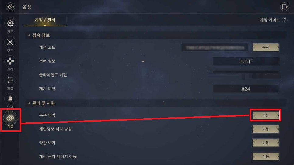 3. 서버와 캐릭터를 선택한 뒤 쿠폰을 복사 붙여넣기 합니다.