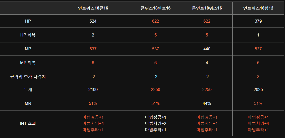 마법사는 추가 스탯 16포인트를 어디에 찍느냐에 따라 성능이 완전히 달라집니다.