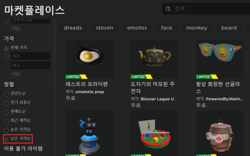 로벅스가 없어도 구입할 수 있는 무료 아이템이 생각보다 많습니다. 해당 링크로 접속하여 좌측 정렬 메뉴에서 "낮은 가격순"을 체크하면 됩니다. 무료 아이템을 인기순으로 보고싶다면 최고/최저 가격을 0원으로 하고 인기상품순으로 정렬하는 방법도 있습니다.