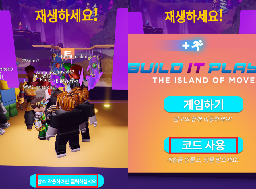 사용방법은 이동의섬 게임 접속후 앞으로 조금만 이동하면 '상호 작용하려면 클릭하십시오' 메뉴가 나옵니다. 이걸 클릭하고 '코드사용'으로 들어가서 아래 코드를 입력하면 보상을 받을 수 있어요.