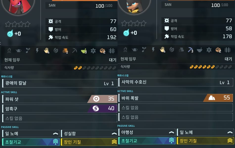 | 작업 팰 | 초절기교 (작업 속도 +75%) 장인기질 (작업 속도 +50%) 일 노예 (작업 속도 +30%) 성실함 (작업 속도 +20%) ※ 야행성 팰이 아닌경우 성실함 → 야행성으로 |