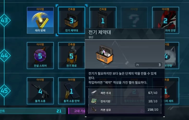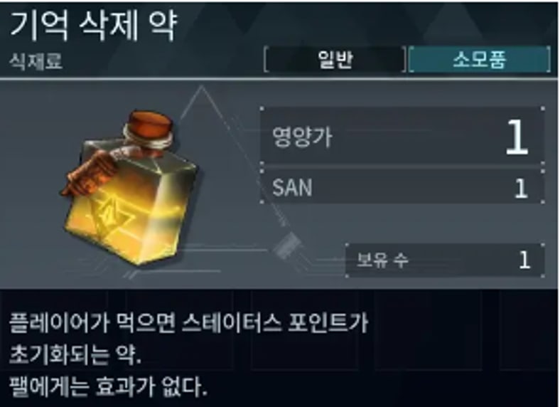 43 렙이 되면 기술 탭에서 전기 제약대를 해금하고 '기억 삭제 약'을 제작할 수 있습니다. 아이템 설명처럼 이 약을 먹으면 모든 스테이터스가 초기화됩니다. 버그로 인해서 강화했던 포획력까지 초기화되어 버리는 문제가 발생했지만 2월 1일 패치로 버그가 해결되어서 마음 편히 사용하셔도 됩니다.